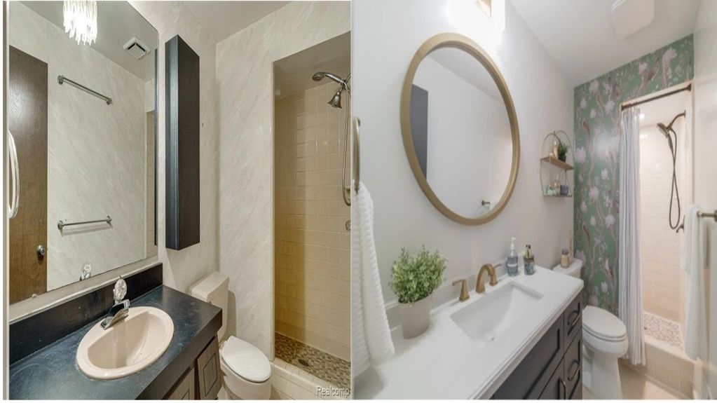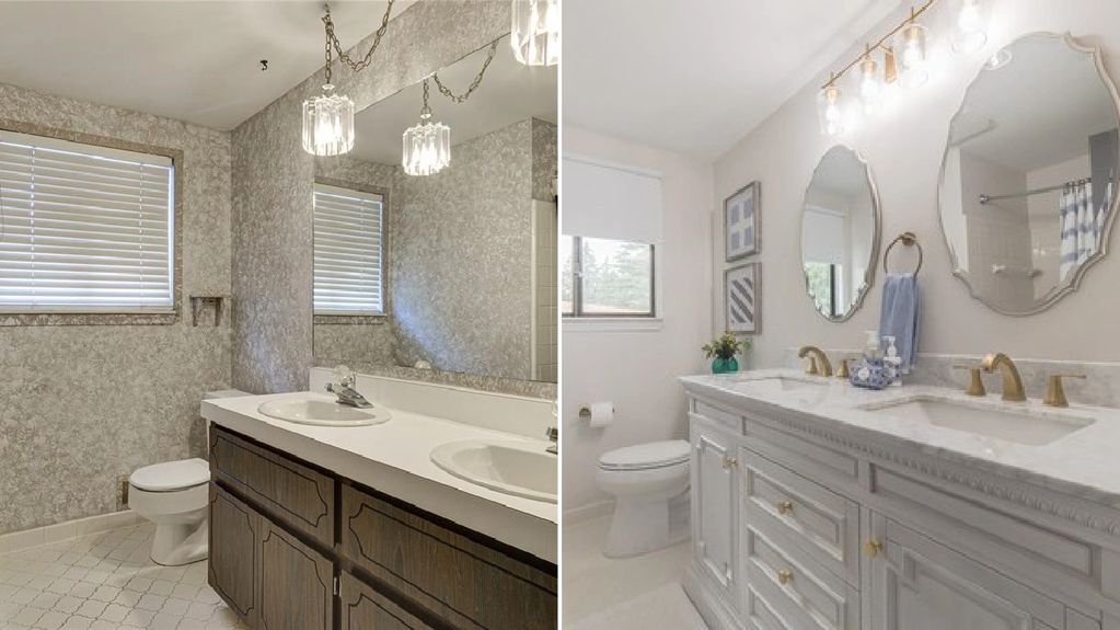 Main shared bathroom, gorgeous marble vanity! From dated & drab to light, bright, & airy!