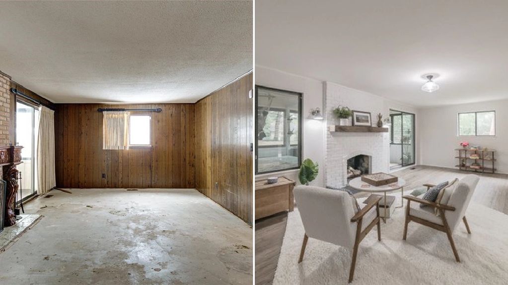 Balmoral Terrace, Clarkston, MI. Exterior before and after- Whole house renovation & staging-From drab to fab! This house was truly transformed!