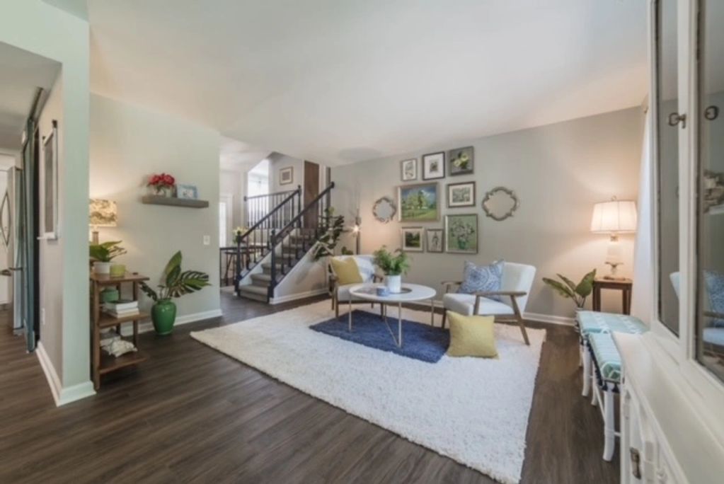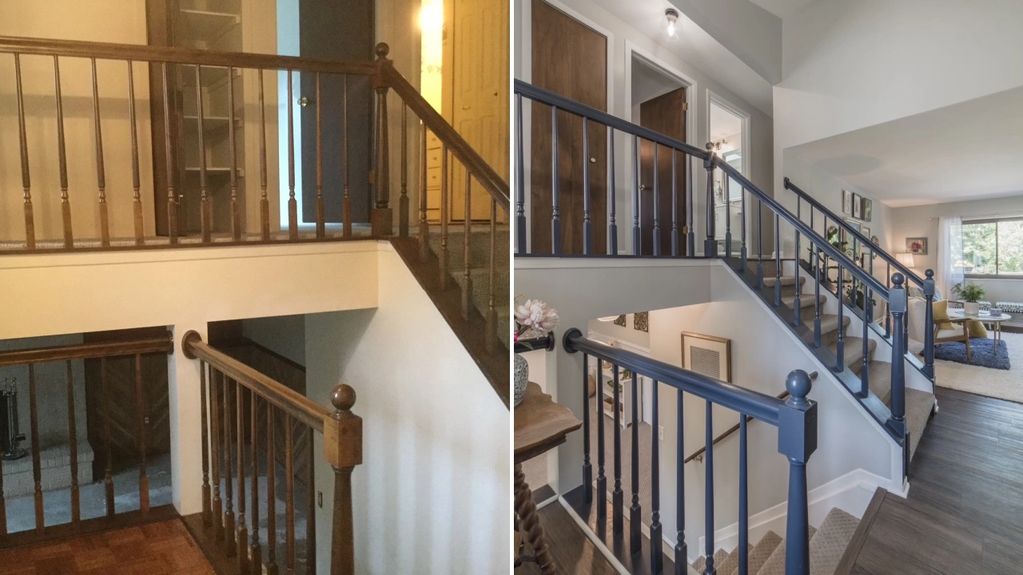 Fresh paint, new flooring throughout, & a crisp charcoal navy paint on the railings made this entry way warm & inviting.
